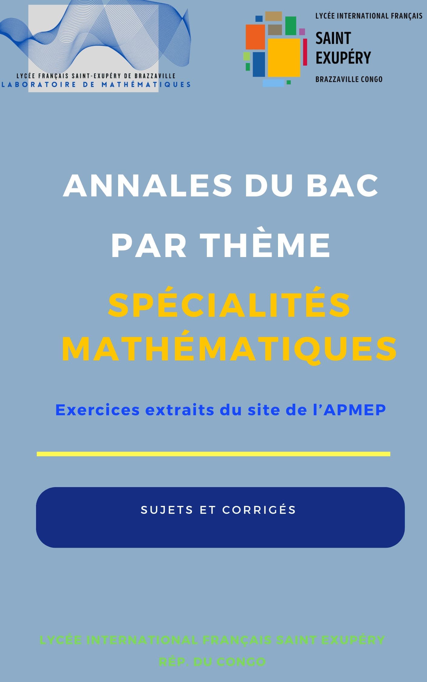 Ce site propose, en téléchargement libre, les sujets et corrigés du brevet de mathématiques et physiques-chimie et du bac série C et D de la République du Congo. Il répond également aux attendus des programmes officiels de nombreux pays d'Afrique : Gabon, Côte d'Ivoire, Cameroun, Benin, Centrafrique, Madagascar ...