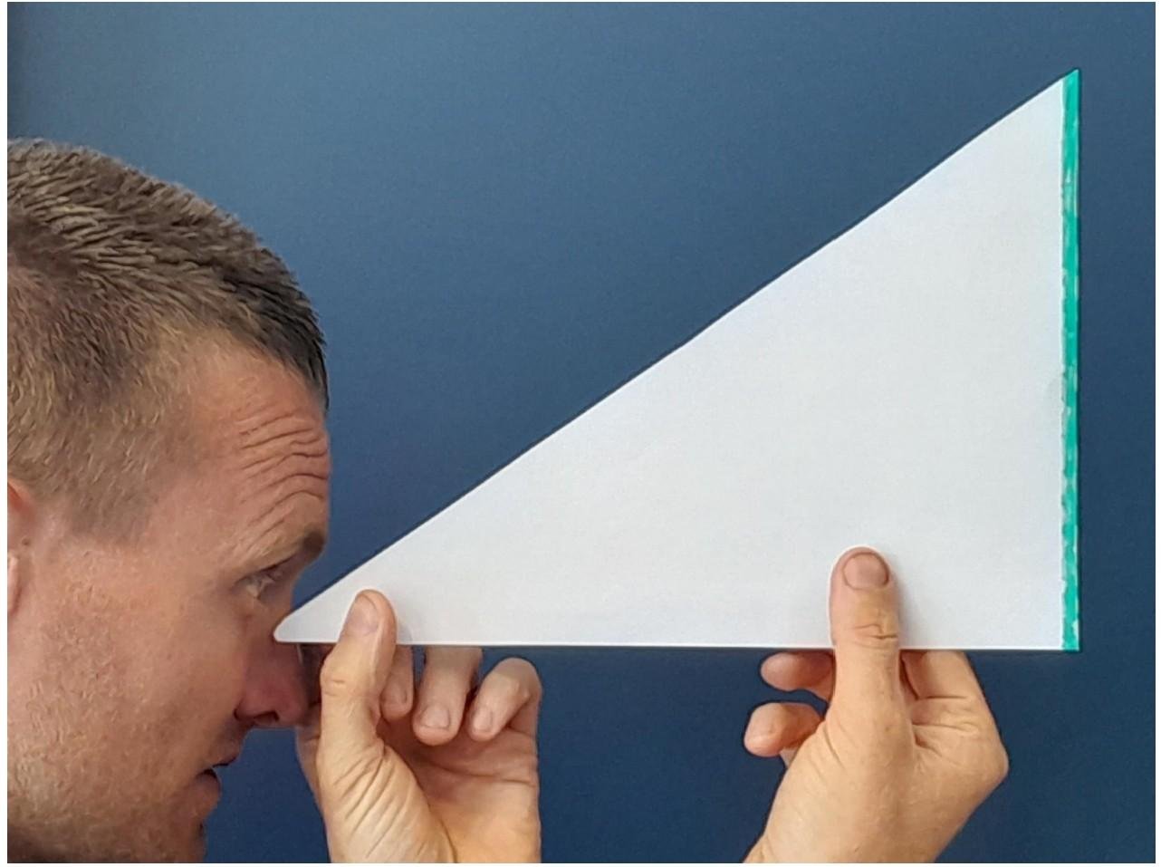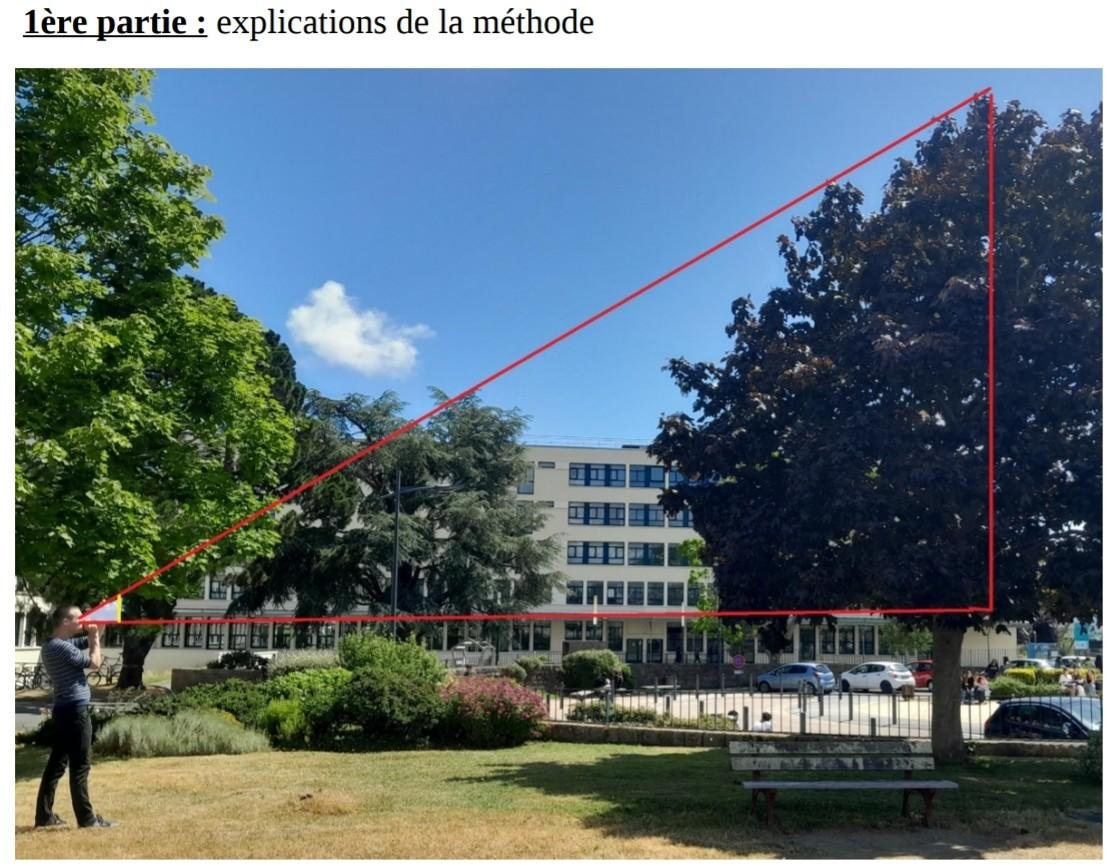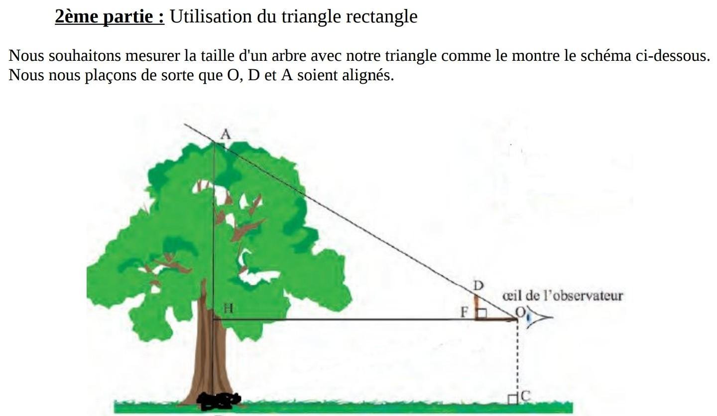 - Nous avons utilisé un triangle rectangle afin de mesurer la hauteur de l’arbre. Maëlys s’est positionnée en observatrice avec une équerre près des yeux de sorte que le côté du triangle rectangle qui est opposé à l’œil de Maëlys soit parallèle à l’arbre.
