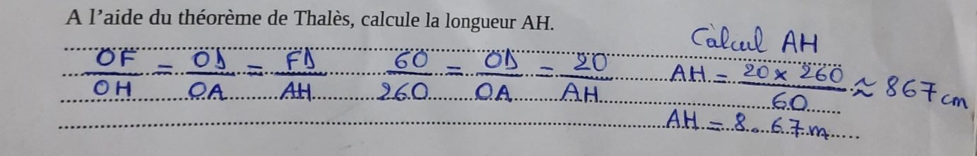 À partir de ces mesures nous avons pu utiliser le théorème de Thalès puisque nous avons admis que (FD) est parallèle à l’arbre.